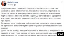 „Доцна вечерва на седница на Владата се изгласа предлог текст на Законот за јавно обвинителство. На насилнички начин, спротивно на Уставот и законите и меѓународните правни стандарди, владејачката партија изгласа закон кој во себе содржи до сега невидени одредби со кои сакаат да го скријат криминалот кој беше направен во последните три години. Во законот не се прифатени забелешките на експертите и тие вечерва се едногласни во констатациите дека овој закон претставува вистинско фијаско. Денес паѓаат во вода наводните заложбите на власта за владеењето на правото, а токму тоа е еден од клучните критериуми за започнување на преговорите со ЕУ. Носење на системски и круцијален закон без политички консезус и негово изгласување по скратена постапка ќе го поткопа и така кревкиот правен систем и наместо владеење на правото ќе донесе исполитизарано и пристрасно јавно обвинителство креирано по мерка и желба на одредена група на луѓе“, напиша Чулев на социјалната мрежа „Фејсбук“ половина час по завршувањето на седницата.