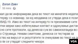 „Би сакал да ве информирам дека во текот на минатата недела имав ТВ интервју со новинар, за кој неодамна се утврди дека е позитивен на КОВИД-19. Иако во текот на интервјуто ги преземавме сите заштитни мерки како избегнување контакт и одржување дистанца, согласно сите протоколи, од денеска сум во самоизолација во мојот дом во Струмица. Немам симптоми, денеска се тестирав за присуство на вирусот и резултатите ги очекуваме во текот на денот - по што ќе се утврдат следните чекори“, напшиа Заев.