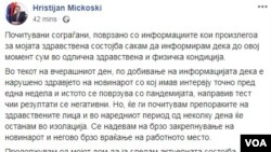 „Сакам да информирам дека до овој момент сум во одлична здравствена и физичка кондиција. Во текот на вчерашниот ден, по добивање на информацијата дека е нарушено здравјето на новинарот со кој имав интервју точно пред една недела и истото се поврзува со пандемијата, направив тест чии резултати се негативни. Но, ќе ги почитувам препораките на здравствените лица и во наредниот период од неколку дена ќе останам во изолација. Се надевам на брзо закрепнување на новинарот и негово брзо враќање на работното место. Продолжувам од мојот дом да ја следам актуелната состојба. Да им даваме поддршка на оние кои се во првата линија против пандемијата. Ја користам оваа прилика да се заблагодарам на сите оние кои пројавија интерес за моето здравје. И понатаму активно ќе се бориме против пандемијата која донесе тешка здравствена, санитарна и економска криза. Сигурен сум дека на крајот заеднички ќе победиме затоа што секој живот вреди и затоа што ја сакаме Македонија“,напиша Мицкоски на „Фејсбук“.