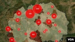 Гледано по градови во Скопје се регистрирани најголем број на заболени лица - 389, во Куманово има 310 случаи а во Прилеп 103. Во Струга има 53 заболени, Дебар -51, Тетово - 48, Велес - 43, Штип - 32.