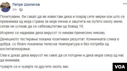 „Денешното тестирање покажа позитивен резултат. Клиничката слика е добра, со благо покачена телесна температура и без потреба од хоспитализорање. Ова е доказ дека вирусот не смее да се потцени и дека мора секој од нас да внимава“, напиша Шилегов.
