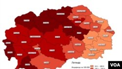 Највисока инциденца на 100.000 жители има во Штип 1.655,5. Во Свети Николе е 1.106,7 на 100.000 жители, Ресен - 892,9 на 100.000 жители, Скопје со 795,8 на 100.000 жители, Куманово - 763,9 на 100.000 жители, Дебар со 742,2 на 100.000 жители, Струга- 673,5 на 100.000 жители и Тетово со 529,1 на 100.000 жители.