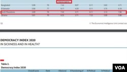 Со индексот на демократија се опфатени 167 држави, а оценувани се по 60 показатели во пет категории – изборен процес и плурализам, функционирање на владата, политичко учество, демократска политичка култура и граѓански слободи. Најдобро рангирани се Норвешка, Исланд и Шведска а најлошо Северна Кореја.