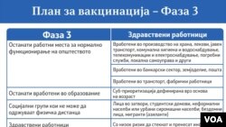 Во втората фаза ќе се вакцинираат здравствените работници со умерен ризик, вработени во витални институции, лица над 65 години и помлади ако имаат коморбитети а во третата фаза ќе се вакцинираат сите останати кои ќе се пријават.