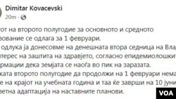 „Стартот на второто полугодие за основното и средното образование се одлага за 1 февруари. Оваа одлука ја донесовме на денешната втора седница на Владата во интерес на заштита на здравјето, согласно епидемиолошките информации дека земјата се наоѓа во пик на заразата. Одлуката второто полугодие да продолжи на 1 февруари нема да влијае на крајот на учебната година и таа ќе заврши на 10 јуни, со соодветна адаптација на наставните планови”, соопшти премиерот Димитар Ковачевски преку социјалната мрежа „Фејсбук“.