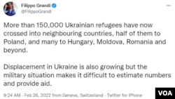 Гранди утрово на Твитер објави дека бројот на внатрешно раселените бегалци во Украина „исто така расте, но воената ситуација го отежнува проценувањето на бројките и обезбедувањето помош“.