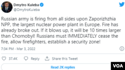 „Руската армија од сите страни пука на Запорожје. Веќе избувна пожар. Ако експлодира ќе биде десет пати поголем од Чернобил“, твитна Кулеба.