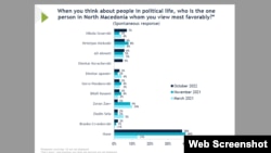 Според истражувањето на ИРИ, ниту еден од политичките лидери нема доволно наклонетост од испитаниците во анкетата. Така „популарноста“ на премиерот-бегалец, Груевски, годинава пораснала и изнесува 7%, кај Христијан Мицкоски е 6%, додека кај премиерот Димитар Ковачевски е 5 проценти.