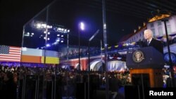„Демократиите во светот ќе чуваат стража над слободата денес, утре и засекогаш“, рече тој во Кралскиот замок, историска знаменитост во Варшава, пред широката толпа полски граѓани и украински бегалци.