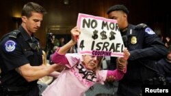 Кога започна сослушувањето, редица демонстранти ги кренаа црвените дамки во воздухот како антивоен протест. Полицијата на Капитол подоцна ги отстрани од сослушувањето откако извикуваа протести „Примирје сега!“ и „Заштитете ги децата од Газа!