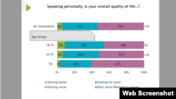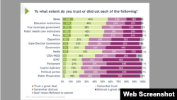 Во истата анкета 58% од испитаниците се изјасниле дека земјата се движи во погрешна насока, додека 53% имаат перцепција дека квалитетот на живот ставува сè полош. Недоверба кон судството изразиле 52%, а кон јавното обвинителство 50%.