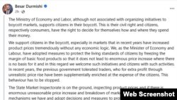 „Министерството за економија и труд, иако не е поврзано со организирање иницијативи за бојкот на пазарите, ги поддржува граѓаните во нивниот бојкот. Тоа е нивно граѓанско право и граѓаните, односно потрошувачите имаат право сами да одлучат како и каде ги трошат своите пари.