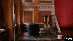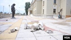 Оштетувања се видливи и од надворешната страна на театарот, на фасадата и оградата.