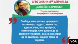 „Сите денови да се бориме и тежнееме, ама за 8-ми Април да се радуваме, бидејќи тогаш се родивме“, напиша етнологот и истражувач на ромската култура Даниел Петровски во рамките на пораките што успешни уметници, професори, претприемачи Роми ги упатија преку институтот „Ромалитико“, по повод 8-ми Април, Светскиот ден на Ромите.