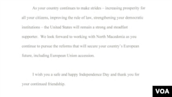 „Како што Вашата земја продолжува да напредува - зголемување на просперитетот за сите Ваши граѓани, подобрување на владеењето на правото, зајакнување на Вашите демократски институции - САД остануваат Ваши силни и непоколебливи поддржувачи. Со нетрпение очекуваме да соработуваме со Северна Македонија на патот на спроведувањето на реформите што ќе ја обезбедат европската иднина на Вашата земја, вклучително и пристапувањето во Европската Унија. Ви посакувам безбеден и среќен Ден на независноста и Ви благодарам за Вашето долгогодишно пријателство“, пишува во писмото на претседателот Бајден до претседателот Пендаровски.